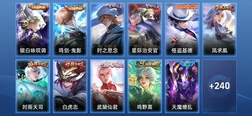 250皮 2典藏 银白咏叹调,鸣剑·曳影 1珍品 怪盗基德 13传说 鸣野蒿,李逍遥 ,时雨天司,启明星使,零号·赤焰,白虎志,时之恋人,凤求凰,武陵仙君,云霓雀翎,地狱火,天魔缭乱,超时空战士 70史诗 龙之律动,天秀·启明,傩神司,逐浪之夏,光弋星穹,化蝶舞,星界战将,百相守梦,妄想食味,奇遇舞章,匿光追影者,黎明之约,高山流水